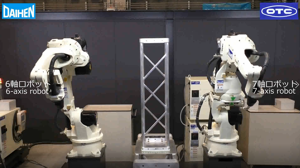 发挥7轴机器人的柔韧性,使用1台机器人迂回旋转并实现全面焊接,降低设备成本。