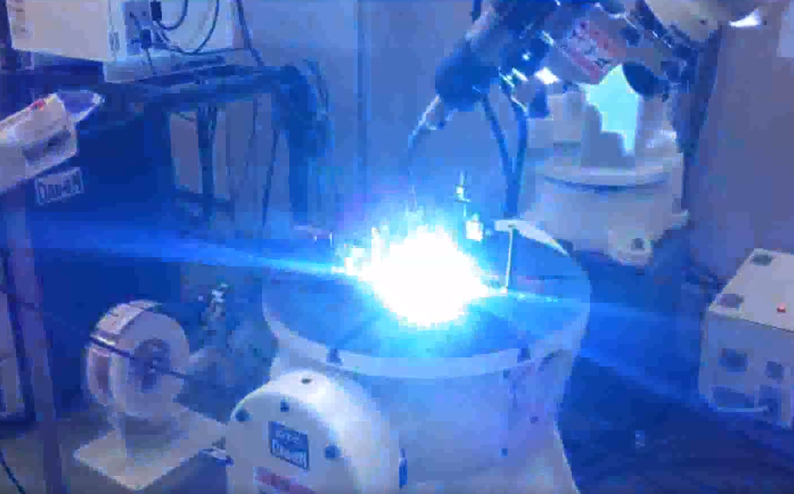 大型搬运机器人与弧焊机器人配合进行全自动焊接。
